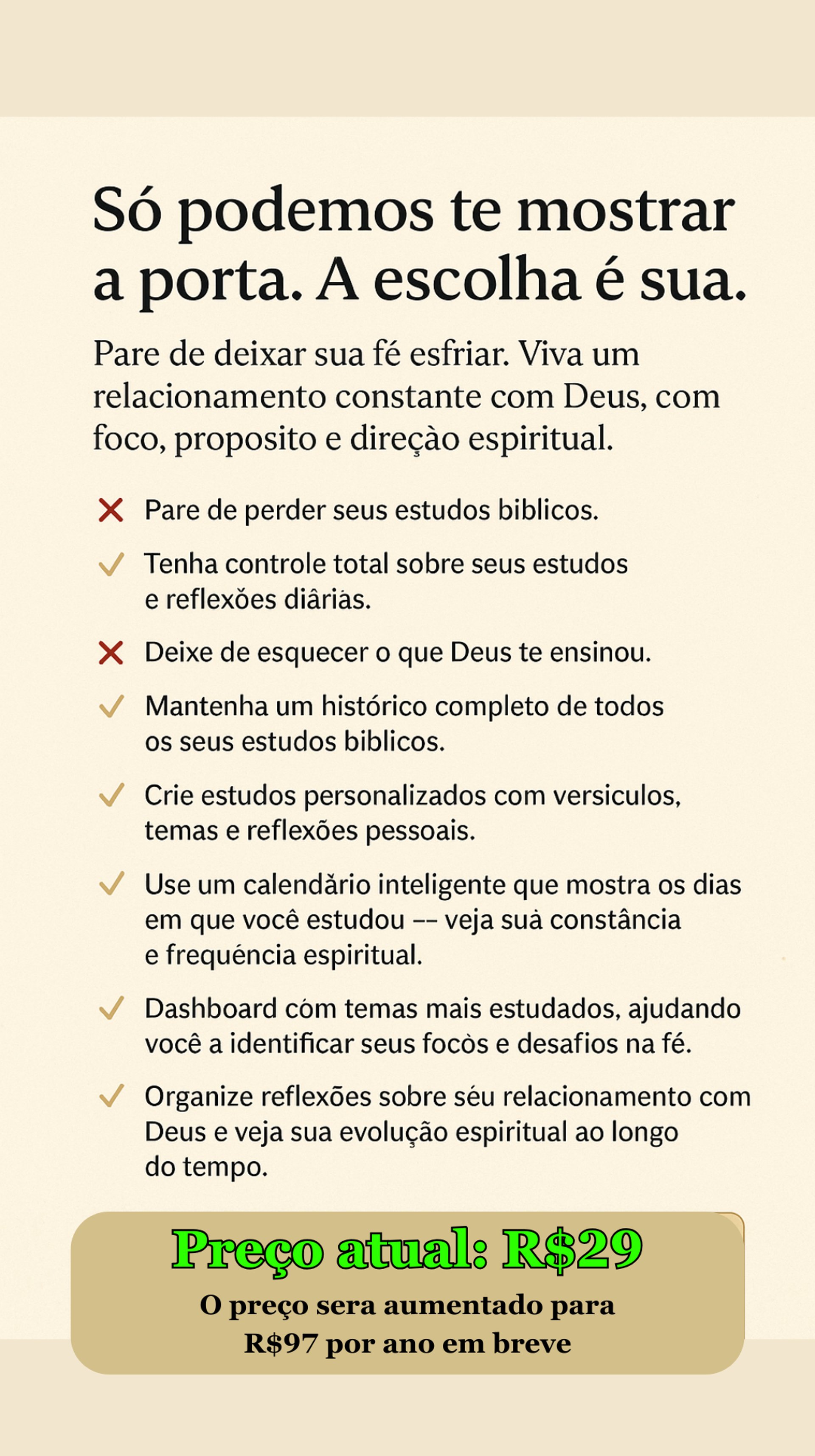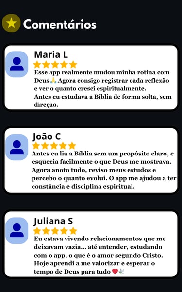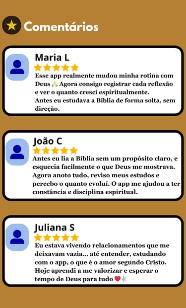 Pare de ler e esquecer. Comece a viver e lembrar. Versículo. Contexto. Reflexão. Aplicação. Tudo guiado. Nada superficial. Sua leitura deixa de ser informação — e vira REVELAÇÃO aplicada à vida real.